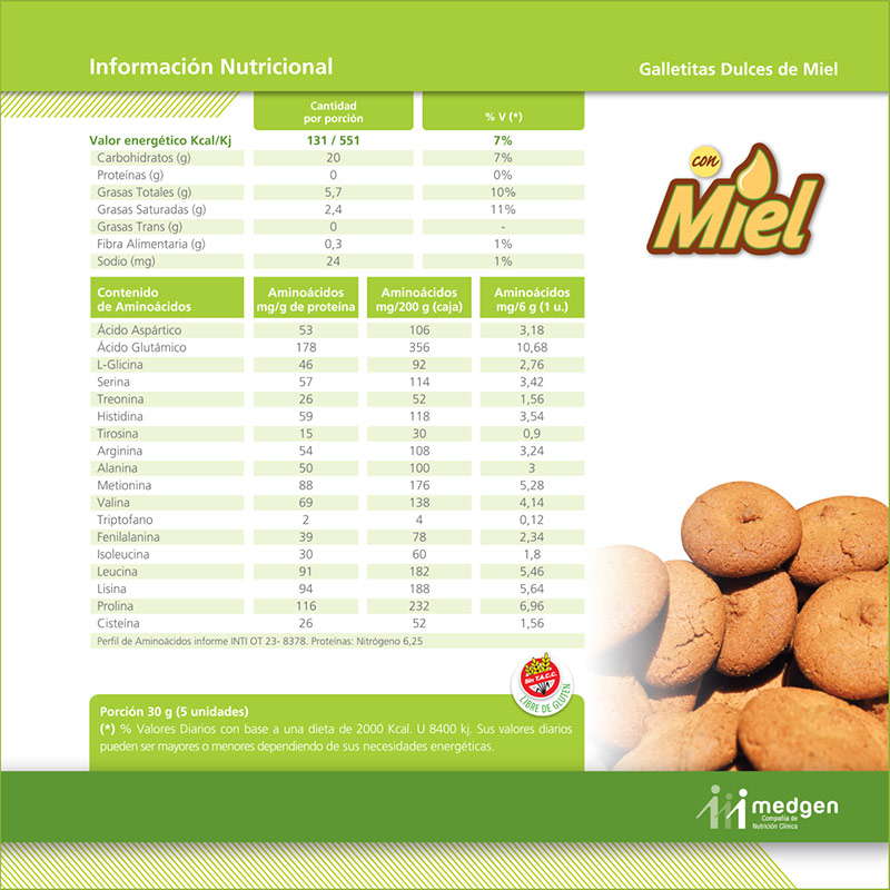 Galletitas de miel, libres de gluten y bajas en proteínas, para ser utilizadas en dietas con restricción proteica y enfermedad celíaca.
